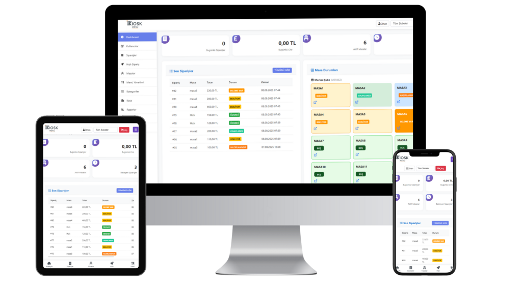 KioskMenu ile müşterileriniz tablet ve telefonlarından hızlıca sipariş versin. Siz de siparişlerinizi, kasanızı ve stoklarınızı tek yerden yönetin.